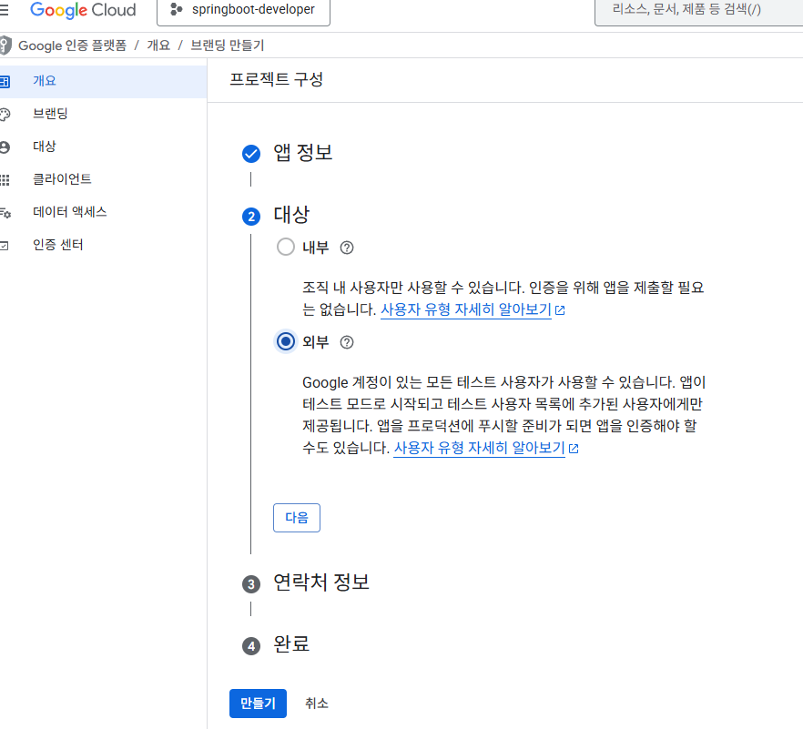 10. ์์ชฝ ์ค๊ฐ์ [์ฌ์ฉ์ ์ธ์ฆ ์ ๋ณด ๋ง๋ค๊ธฐ] - [OAuth ํด๋ผ์ด์ธํธ ID] ํด๋ฆญ