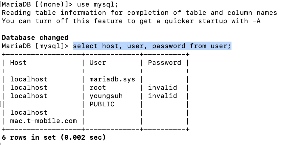 select host, user, password from user;