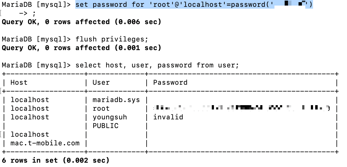 set password form 'root'@'localhost'=password('๋น๋ฒ');